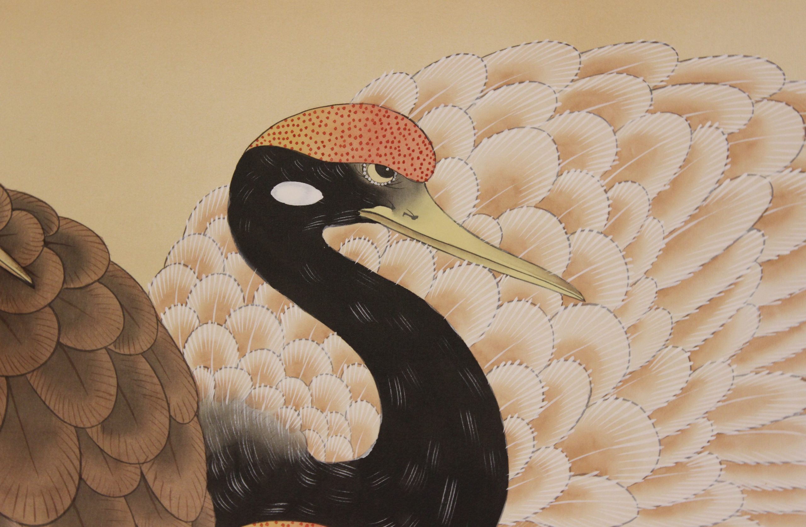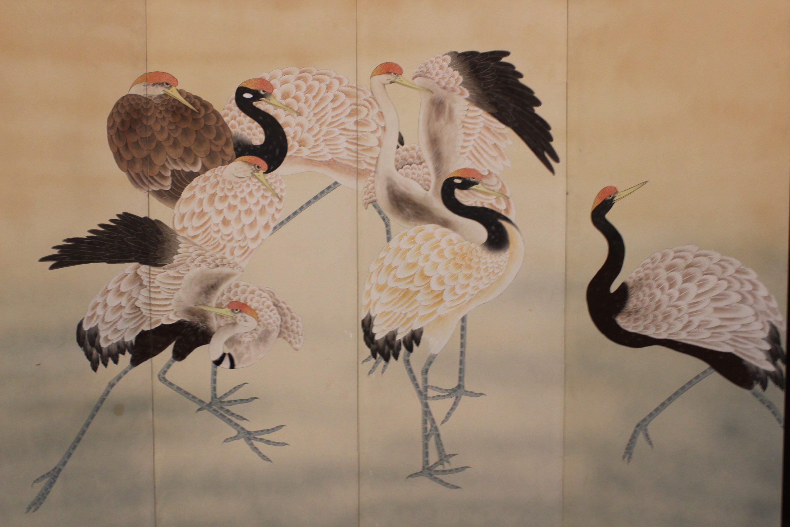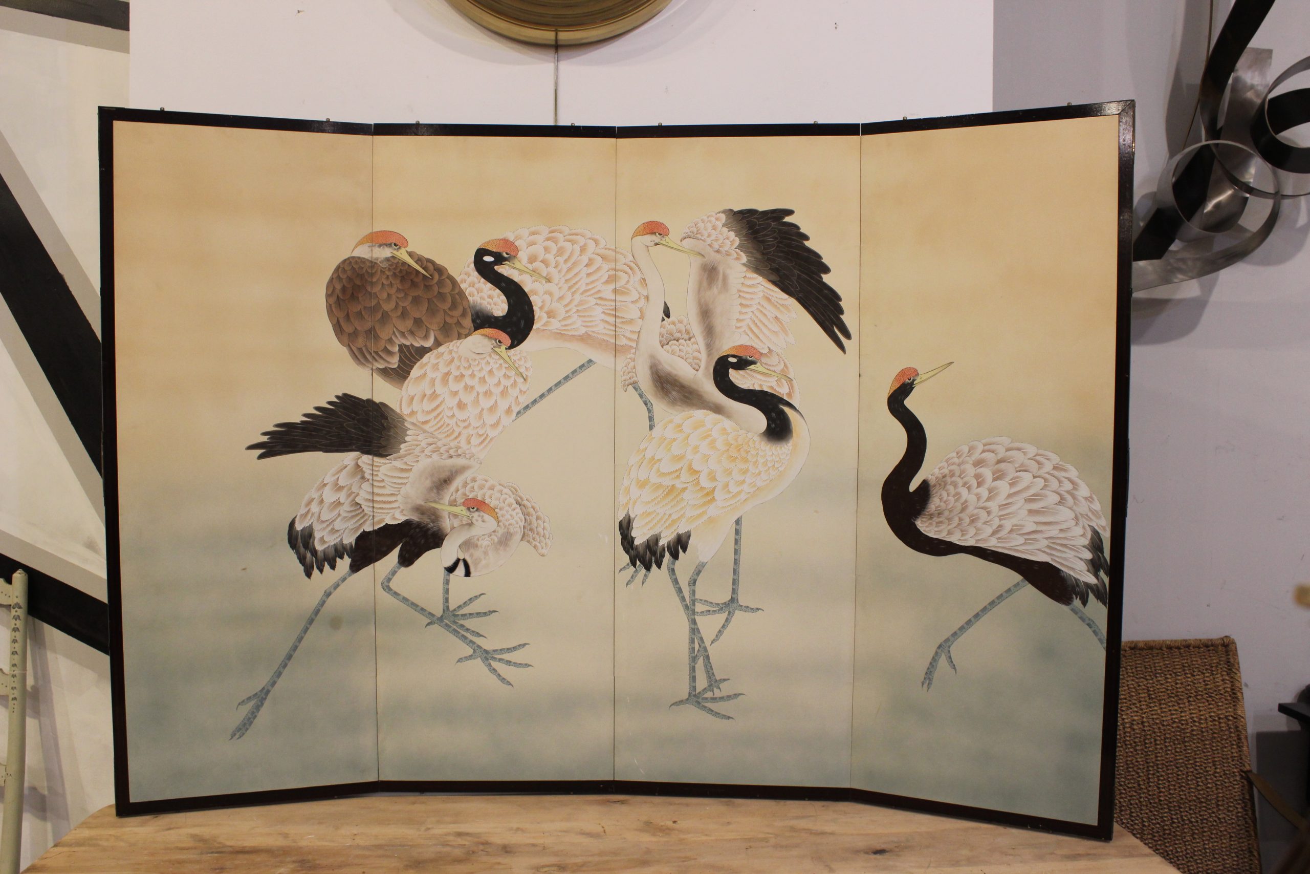 BIOMBO DE MADERA CON DECORACION DE GARZAS SOBRE PAPEL Y CANTOS CON MOTIVOS DECORATIVOS METALICOS