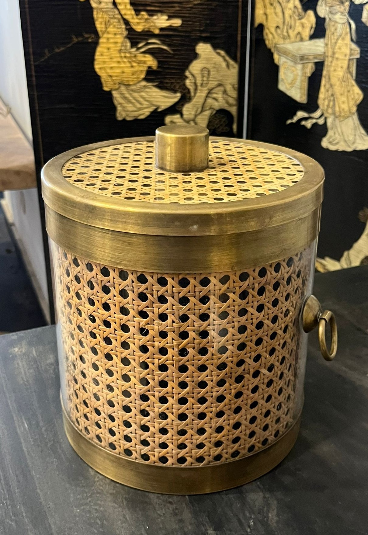 HIELERA DE LATÓN PULIDO Y METACRILATO COLADO CON MIMBRE