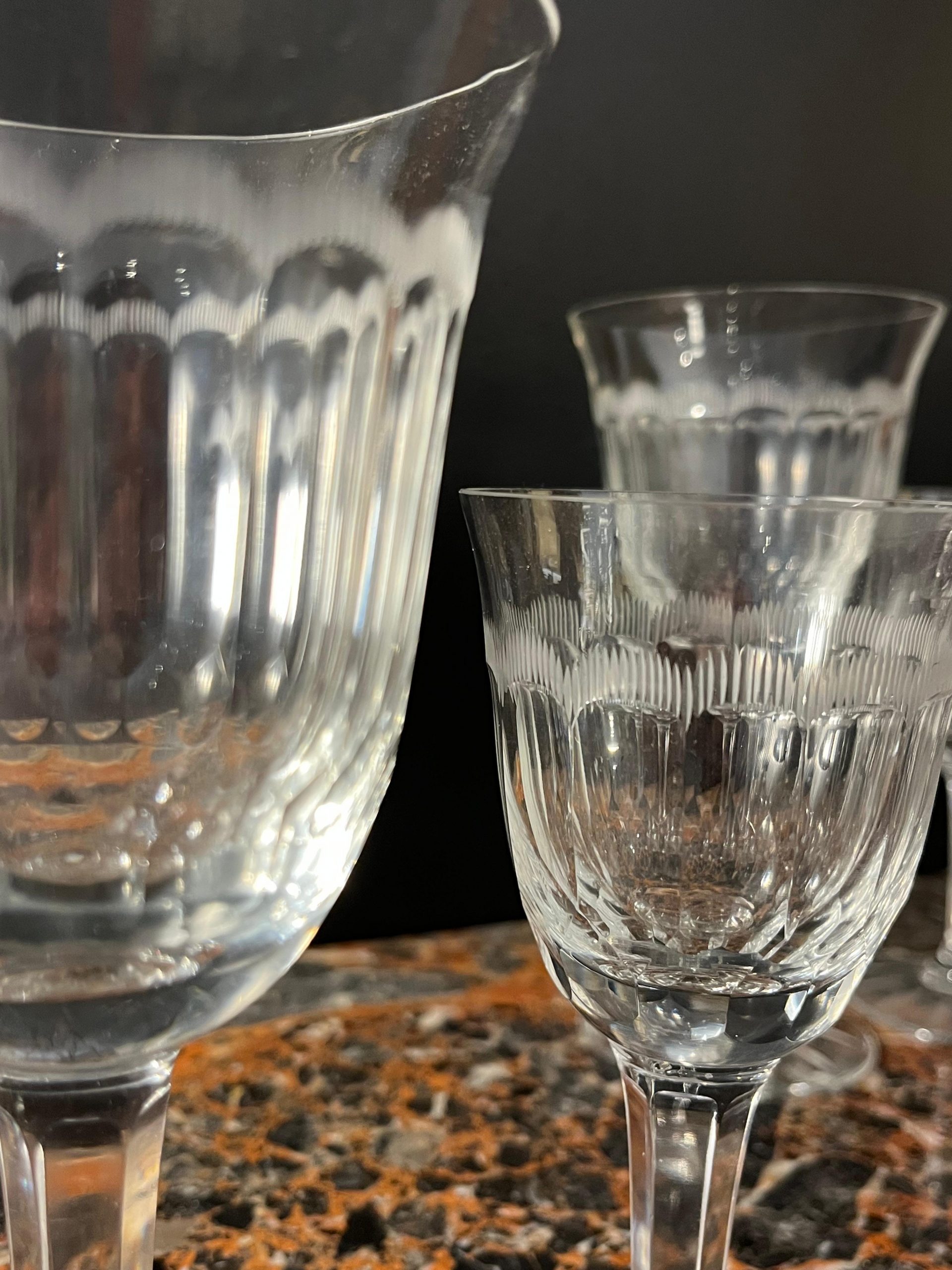 JUEGO DE COPAS DE VINO MODELO «MOLIÉRE DE BACCARAT» EN TRES TAMAÑOS, CRISTAL TRANSPARENTE GRABADO