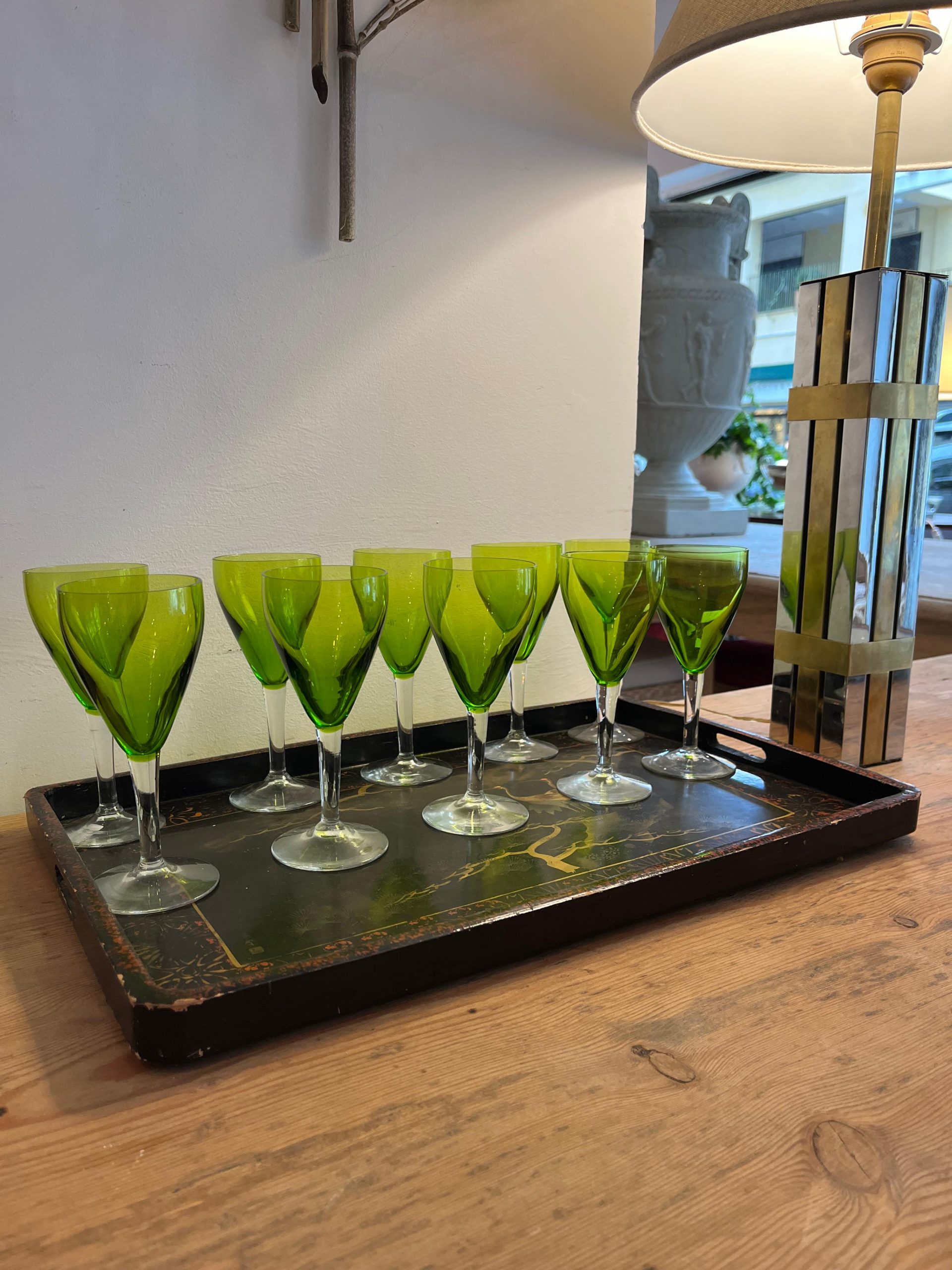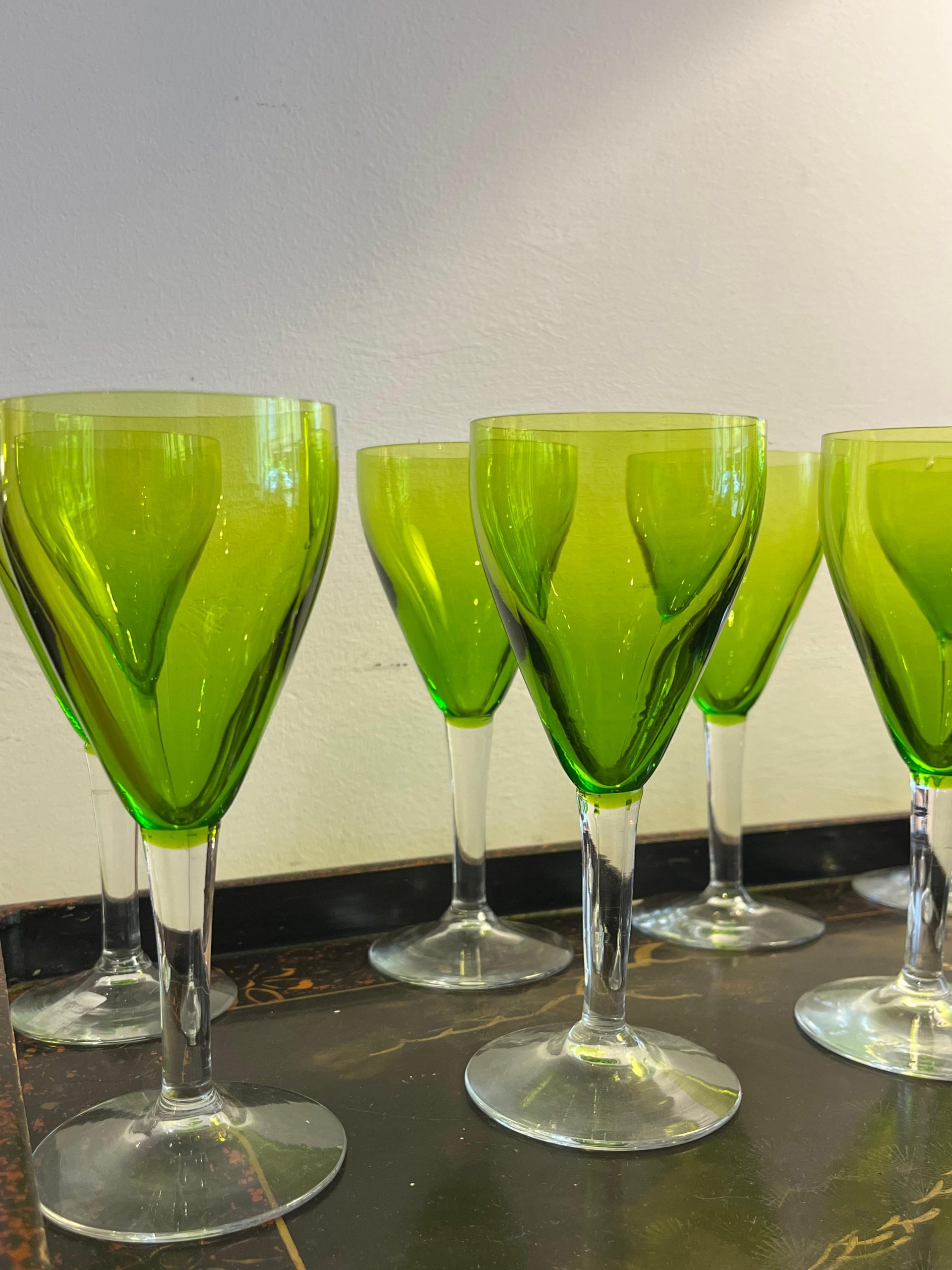 JUEGO DE DOCE COPAS DE VINO, CRISTAL VERDE «CHARTREUSE GENOVA» DE BACCARAT.